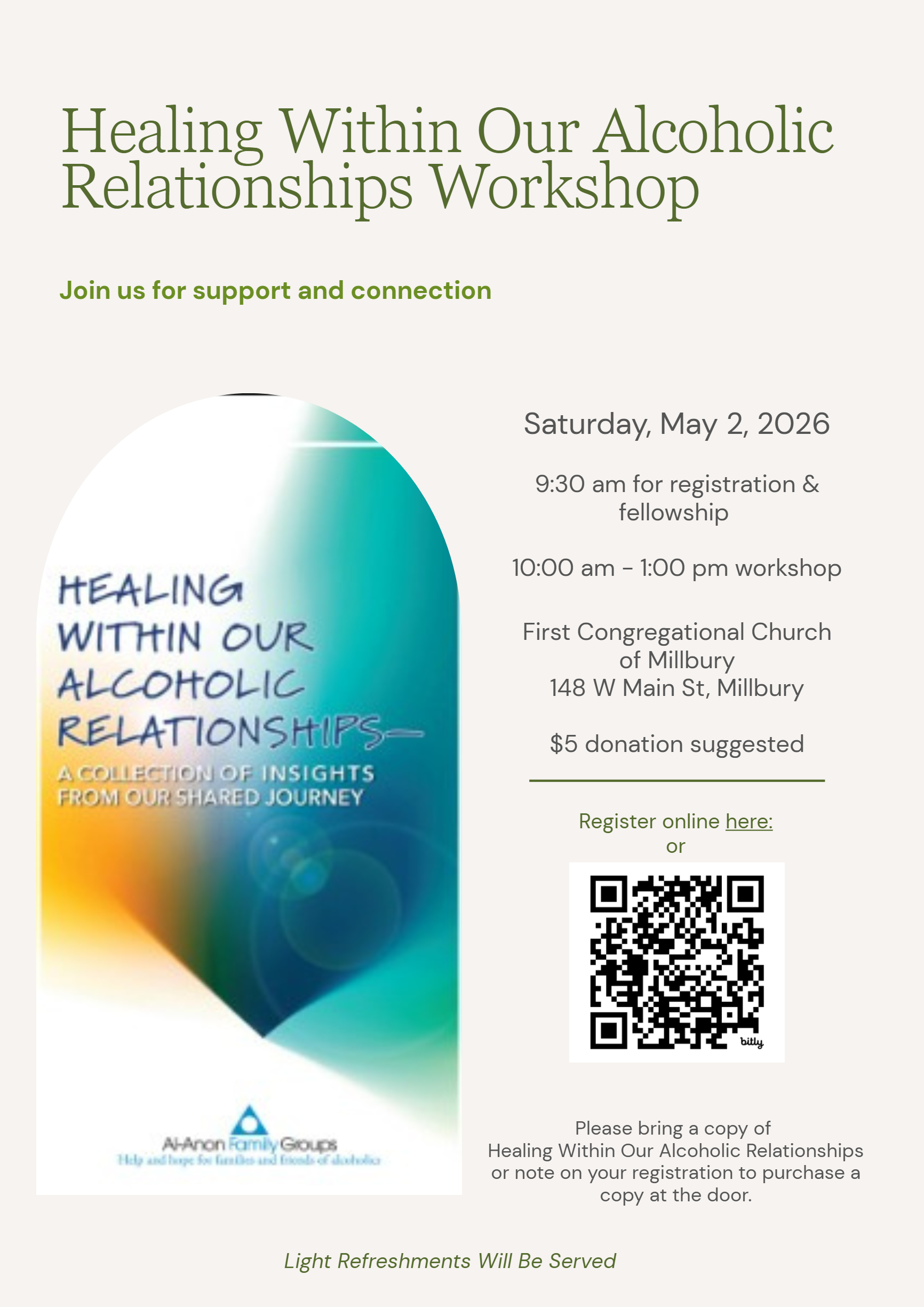 Hosted by: Massachusetts Area Please join fellow members for a morning of fellowship and support for Healing within our Alcoholic Relationships. Address: |