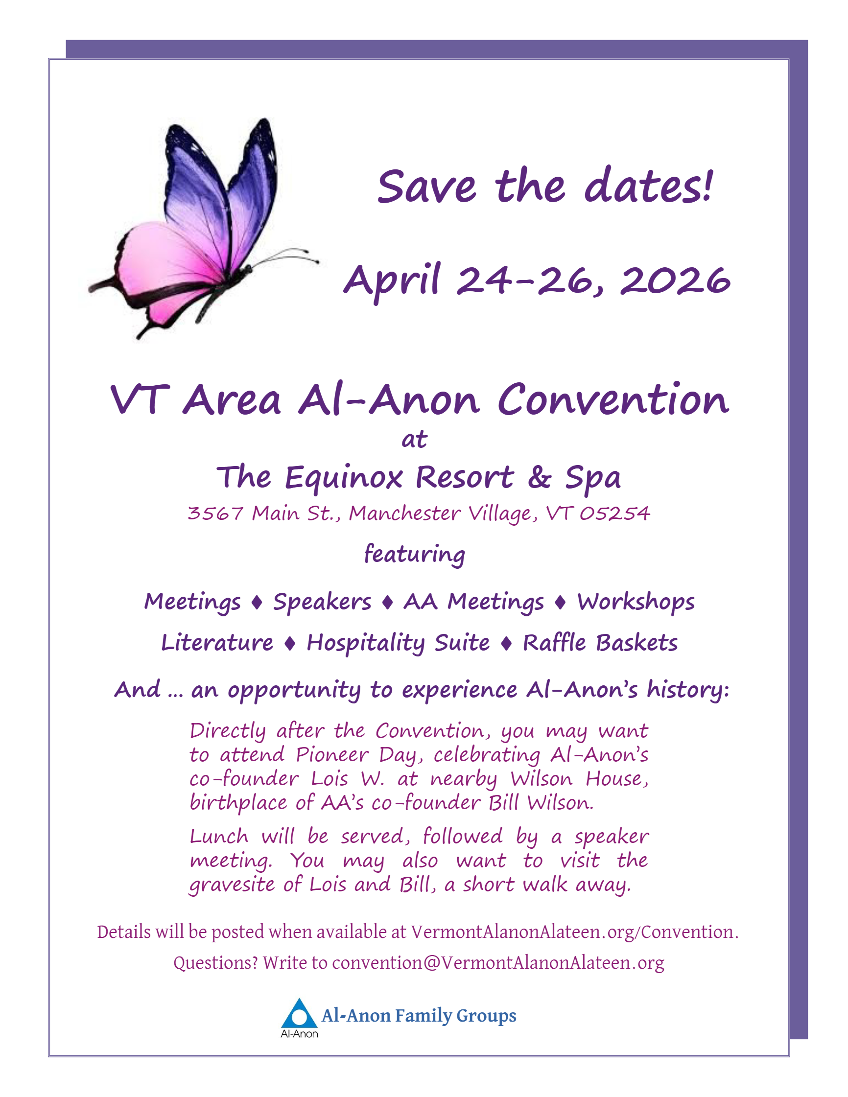 2026 VT Al-Anon Convention Our Annual AFG Convention is being held at the historic Equinox Hotel in Manchester, Vermont. From April 24th |