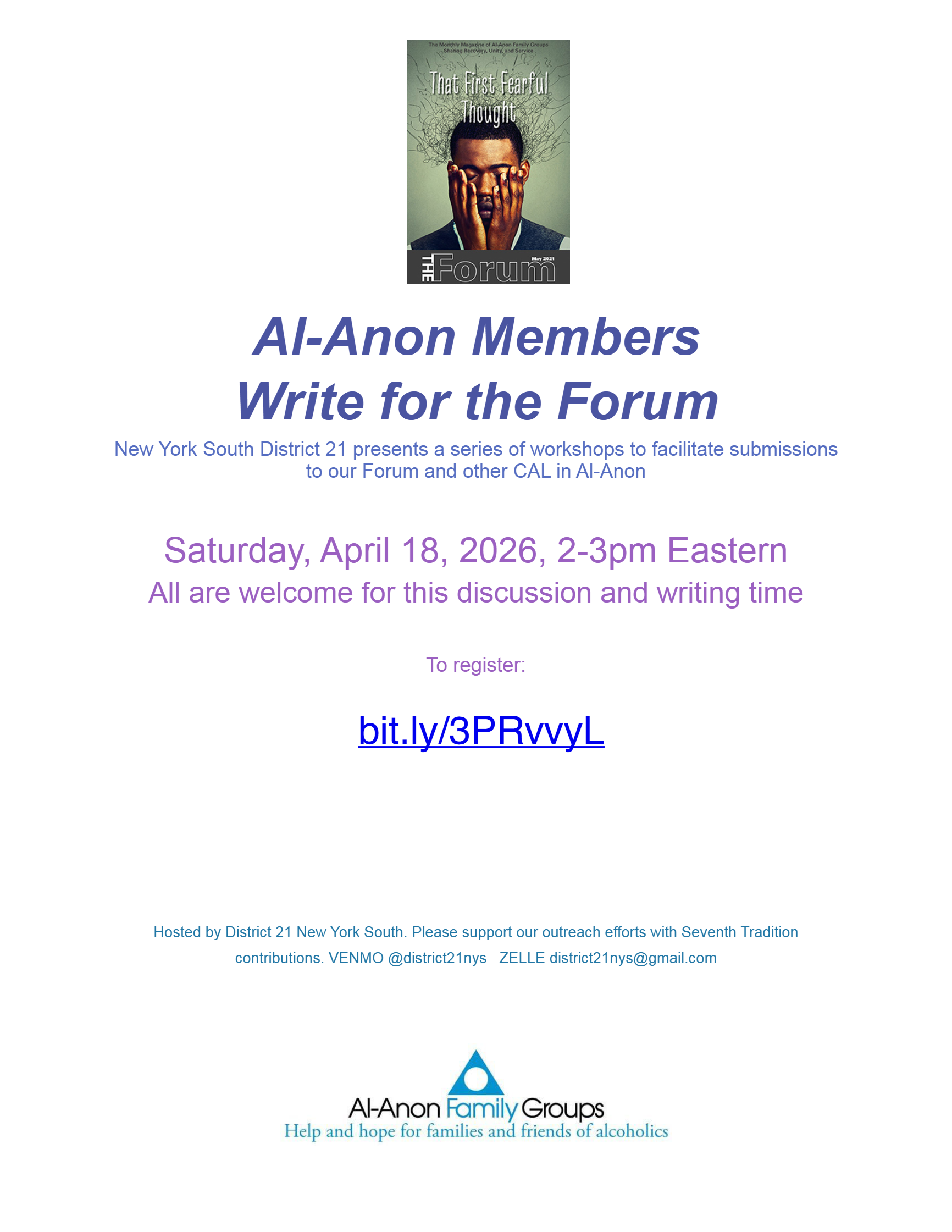 Please Consider Sharing Al-Anon Members Write for The Forum Online Workshop. New York South District 21 presents a series of workshops to