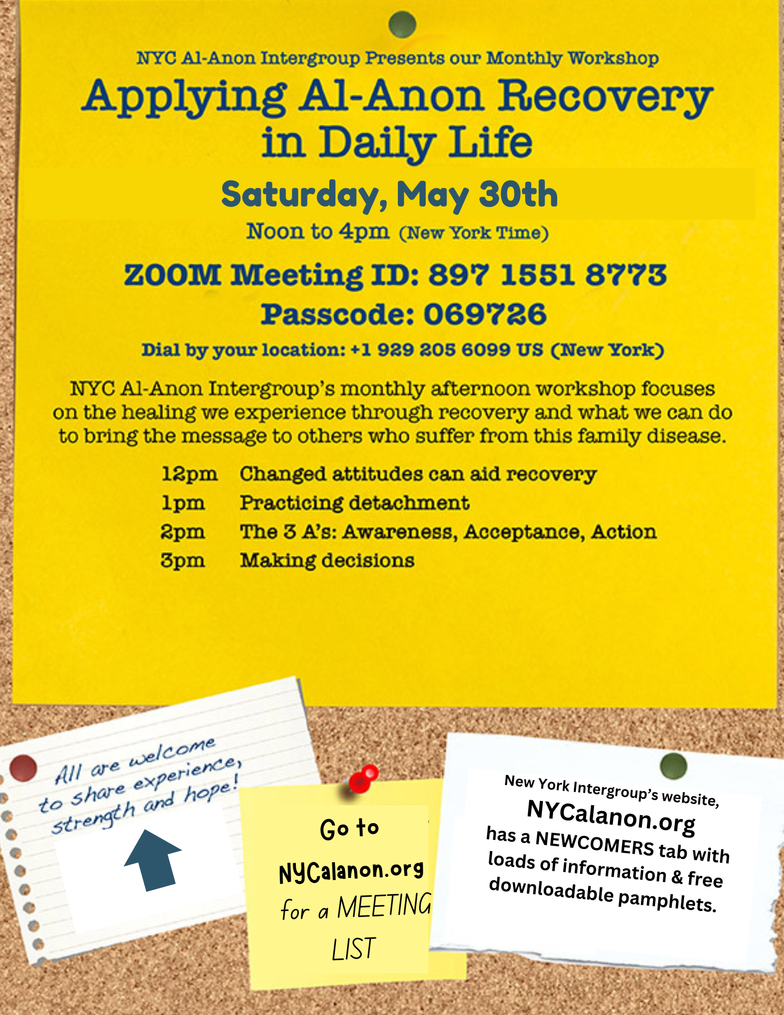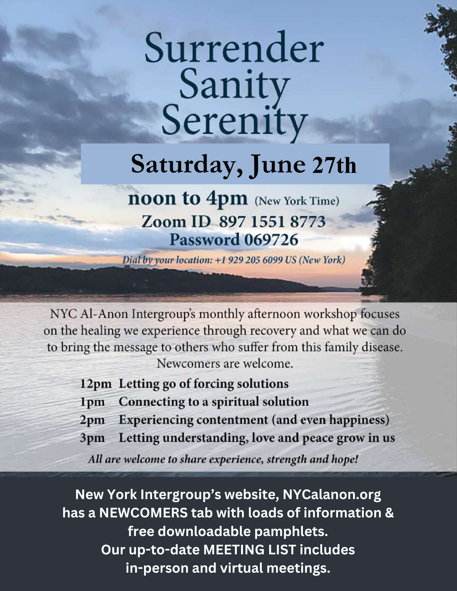 Hosted By: New York South Area NYC Intergroup presents 4 back-to-back Speaker meetings with timed shares Zoom ID:897 1551 8773 Passcode:069726